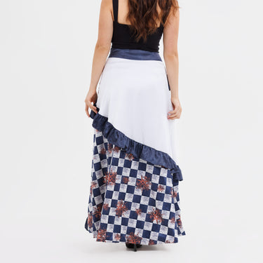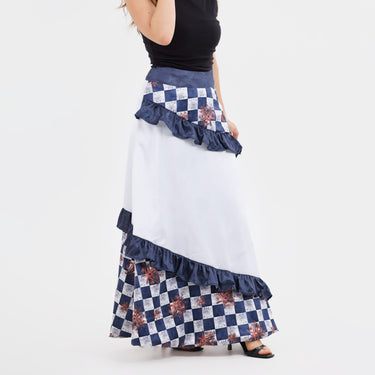A dialogue of movement and contrast. This tiered skirt is composed of two expanses of the Astral Dynasty artwork, balanced by a single tier of pure white. Royal blue frills run across the body in circular tiers, lending rhythm and richness.