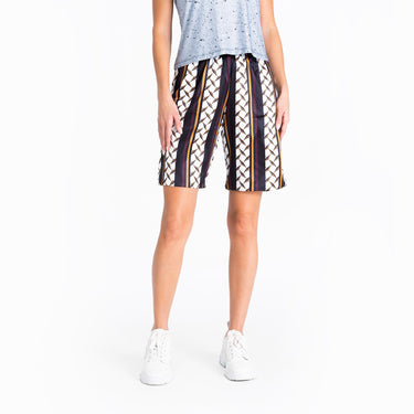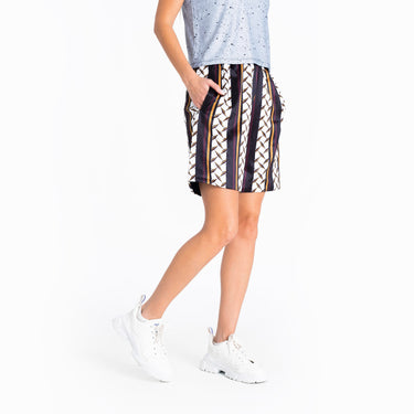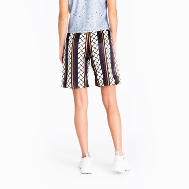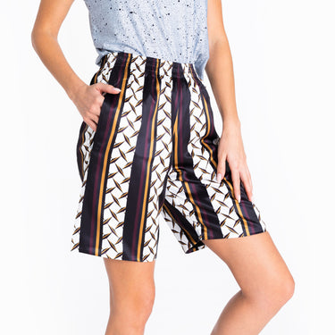 The "By Invitation Only" shorts radiate exclusivity, confidence, and sophistication, featuring a sleek geometric print that celebrates symmetry. The luxurious fabric is reinforced with a soft crepe lining. The elasticated waist and the practical pocket detail make the streetstyle shorts for women as stylish as they are comfortable. These casually confident and cool streetwear shorts are the perfect piece for making a bold style statement.